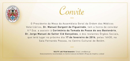 A Cerimónia de Tomada de Posse do Bastonário, Dr. Jorge Cid, e dos Órgãos Sociais da OMV eleitos para o quadriénio 2016-2019 irá decorrer no próximo dia 17 de fevereiro, pelas 16:30, na Sala Fernando Pessoa, no Centro Cultural de Belém, em Lisboa.