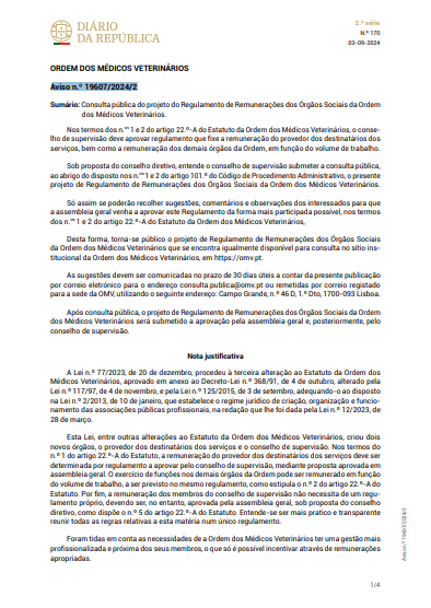 Divulga-se o Aviso n.º 19607/2024/2, publicado no Diário da República, 2.ª série, n.º 170, de 03 de setembro (Aviso n.º 19607/2024/2) referente à Consulta pública do projeto do Regulamento de Remunerações dos Órgãos Sociais da Ordem dos Médicos Veterinários.