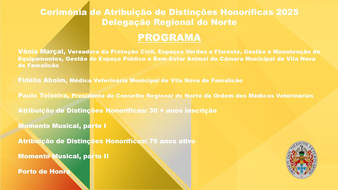 A Cerimónia de distinção dos membros da Delegação Regional do Norte da OMV por 30 Anos de inscrição e 75 anos ativos irá realizar-se no dia 14 de novembro, no Centro de Estudos Camilianos, sito na Avenida de São Miguel, 758, 4770-631, São Miguel de Seide, em Vila Nova de Famalicão, pelas 17h00.