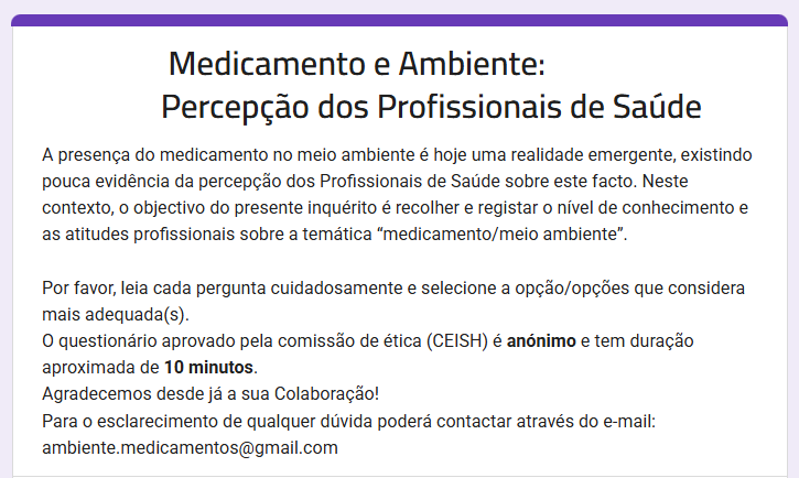 Neste âmbito, foi desenvolvido um inquérito anónimo, aprovado pela Comissão de Ética (CEISH), dirigido a profissionais de saúde. O objetivo é avaliar o conhecimento, perceção e práticas relacionadas com o impacto ambiental dos medicamentos, bem como identificar necessidades de formação nesta área.