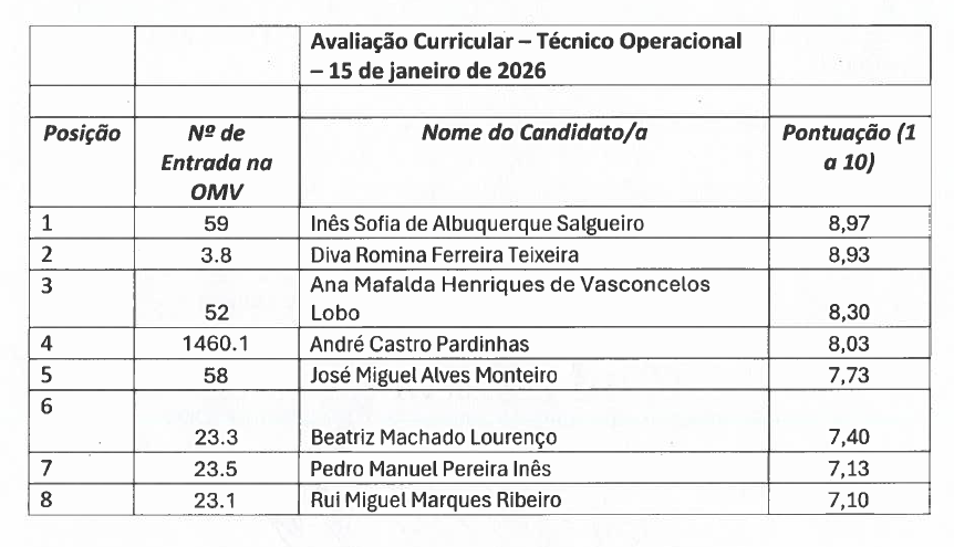 No âmbito do processo de recrutamento para o cargo de Técnico/a operativo/a promovido pela Ordem dos Médicos Veterinários (OMV) e em cumprimento do disposto no número 2 do artigo 12.º do Regulamento n.º 552/2017, de 16 de outubro, publica-se: